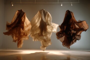 Three dancers in flowing fabrics levitate gracefully in a softly lit studio during a contemporary dance performance