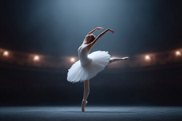 Elegant ballerina gracefully performs a classic ballet pose on stage, illuminated by dramatic lighting. Symbolizes artistry, dedication, and the beauty of dance.
