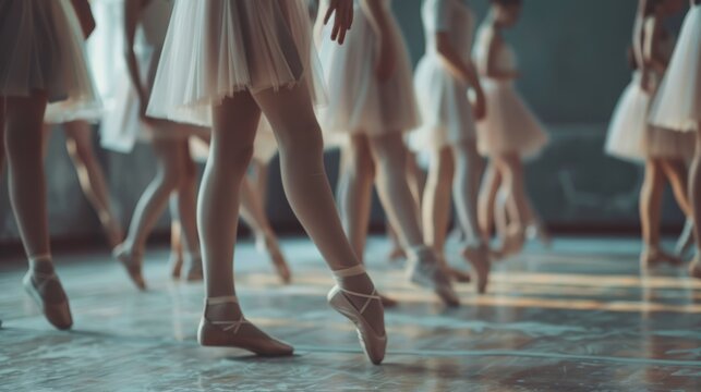 Graceful ballerinas wearing white tutus practice their routine in an elegantly lit dance studio, highlighting their precise movements and form.