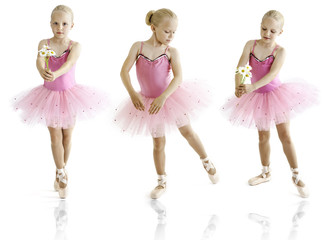 Beautiful little ballerina on floor over white background