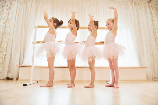 Working with coach. Little ballerinas preparing for performance by practicing dance moves