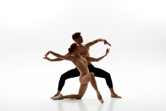 Classical ballet on stage of Theater. Ballet dancers on stage dance classical works. Form of artistic ball dance on stage of theater.