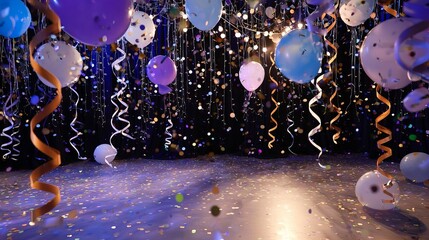 Festive party background with colorful balloons, confetti, lights, and streamers celebration scene