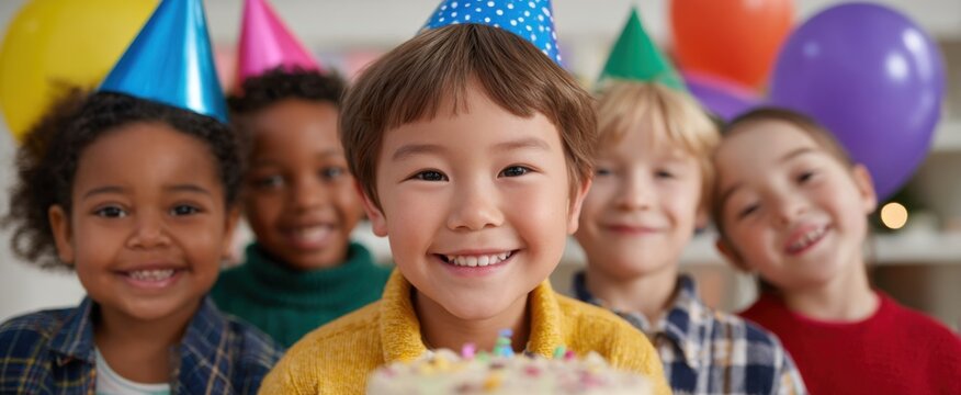 the kids are happily partying with balloons and cake at a birthday bash