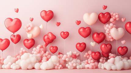 vibrant display of red and pink heart shaped balloons surrounded by soft clouds, creating festive and romantic atmosphere. Perfect for celebrations!
