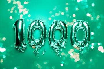 Balloon Bunting for celebration Happy 1000th Anniversary made from Silver Number Balloons on green background with bokeh lights. Holiday Party Decoration or postcard concept with top view