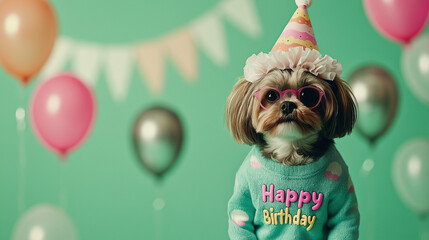 Shih Tzu in birthday sweater with balloons against mint green background