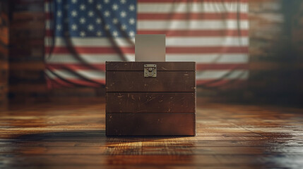 A voting ballot box for an American presidential election sits in front of a US United States Stars and Stripes national flag in a hall. Ballot paper coming from the box.