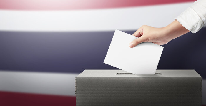 Close-up hand holding ballot paper into the voting box an Thailand flag background. Freedom democracy concept. Freedom vote concept.