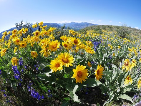 Arnica or Balsamroot flowers on hills above Columbia River. Oregon. USA
