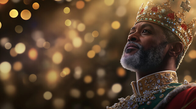 King balthazar wearing vibrant royal attire and golden crown during three kings parade with copy space. Ideal for promotions, social media posts or ads