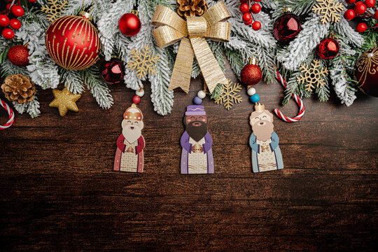 Happy Three King's Day, of January 6. The three wise men over wooden background. Concept for Dia de Reyes Magos day. Three Wise Men flat lay with Christmas decorations