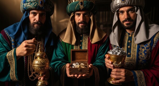 Three diverse men with a joyful mood dressed as the Biblical Magi holding gifts against a snowy winter backdrop
