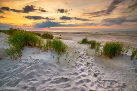 Baltic sea at beautiful sunset in Miedzyzdroje beach. Polish baltic coast. Famous city among the tourist.
