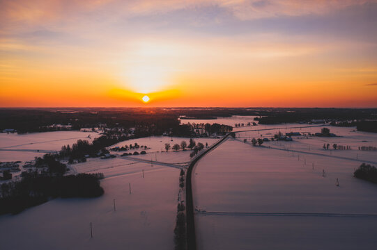 Beautiful winter sunrise over countryside road and fields
