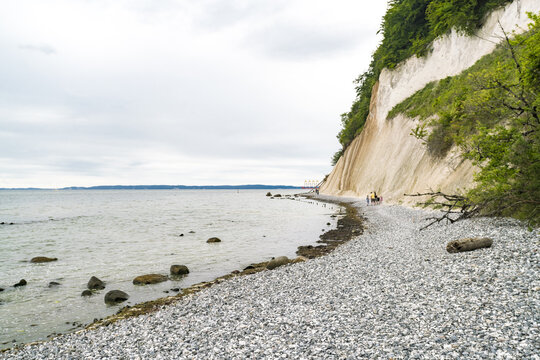View of chalk cliffs rise majestically above the pebbled beach where the Baltic Sea glistens under an overcast sky, Sassnitz, Mecklenburg-Vorpommern, Germany.