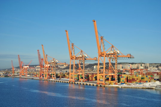 Towering container cranes silhouetting port at sunset golden hour with vessels and gulls