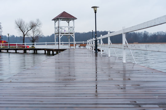 Wooden bridge on the water on a rainy day.