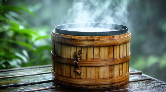 Steaming bamboo container in rain forest setting