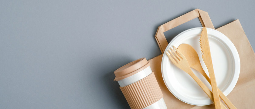 Eco friendly disposable tableware on a brown background