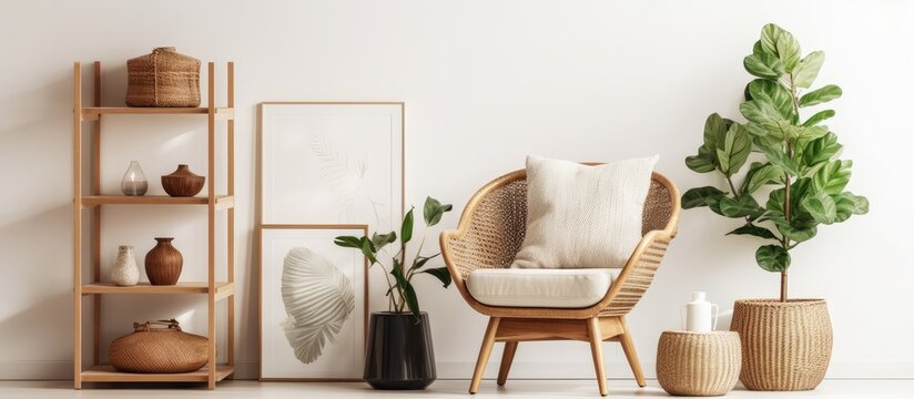 Stylish home decor with modern bohemian vibes featuring retro chair rattan basket wooden cube books flowers mock up poster frames and elegant accessories With copyspace for text