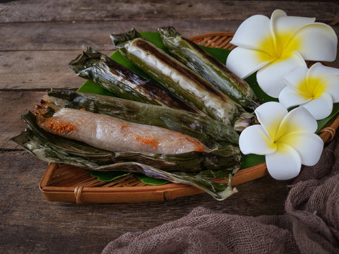 A Malay traditional dessert called Pulut Panggang on bamboo dustpan over wooden background.