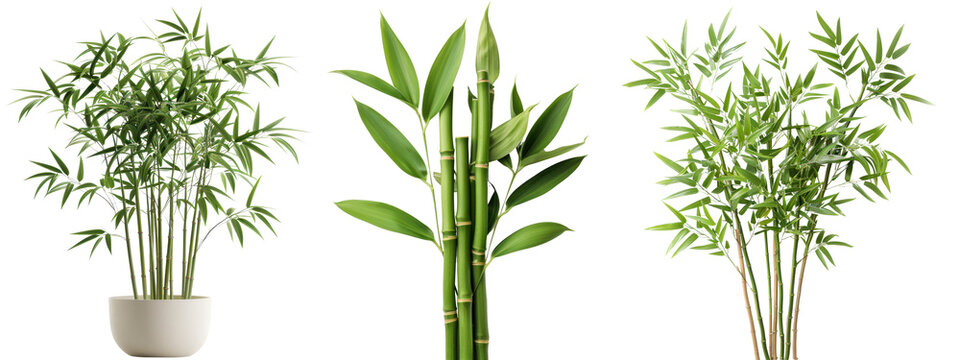 A collection of different types of bamboo plants, showcasing vibrant green foliage and various growth forms in a clear background.