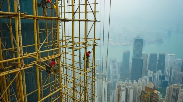 Traditional bamboo scaffolding used in modern skyscraper construction in Hong Kong