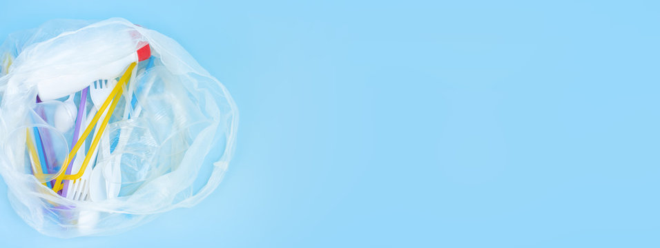 Plastic waste, plastic utensils on a blue background,flat lay. Say no to single use plastic. Ecology environmental care.Banner.Copy space for text.