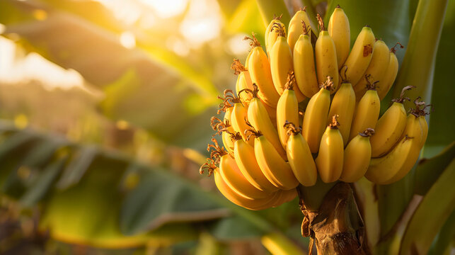 Outdoors sunny garden full of tropical banana tree plants full of a bunch of yellow ripe banana fruits and large exotic green leaves casting the shadow. Organic food growth, plantation and farming
