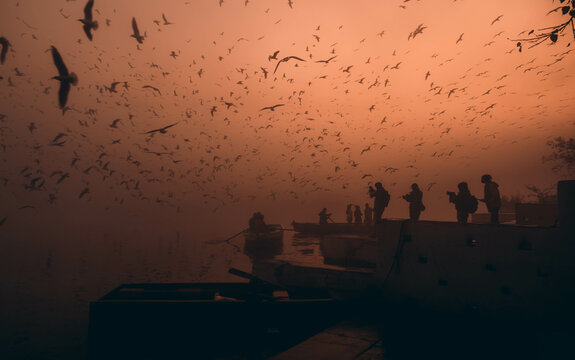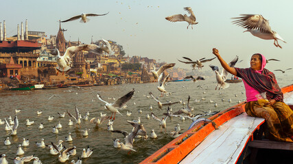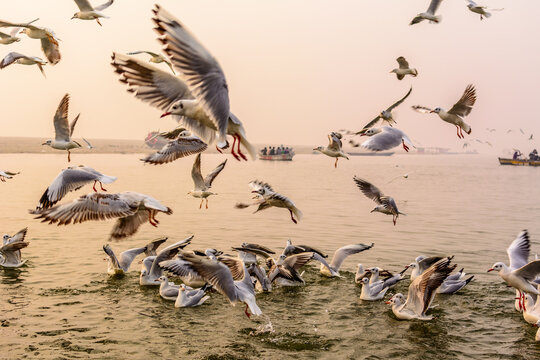 Migratory seagulls on the holy Ganges river in Varanasi, India