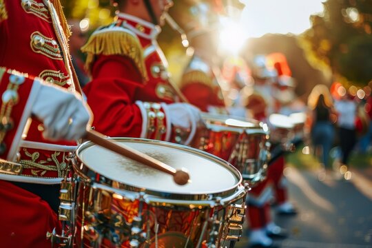 Musician plays headless tambourine in marching band selected focus
