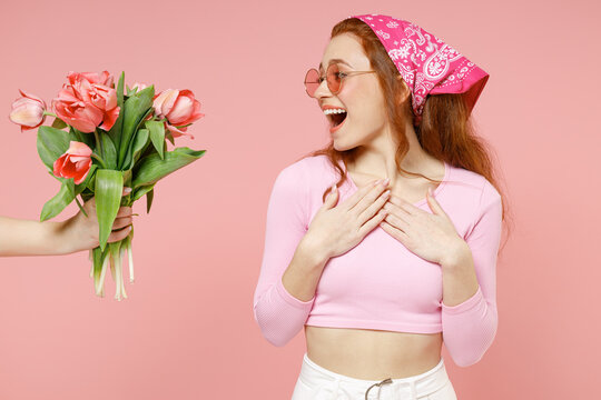 Man hand hold give bouquet of tulips flowers. Young surprised woman 20s in rose clothes bandana glasses hold folded arms isolated on pastel pink color background studio portrait Spring season concept