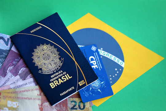 Passport book of Federative Republic of Brazil, CPF taxpayer card and brazilian reais money bills on flag background close up