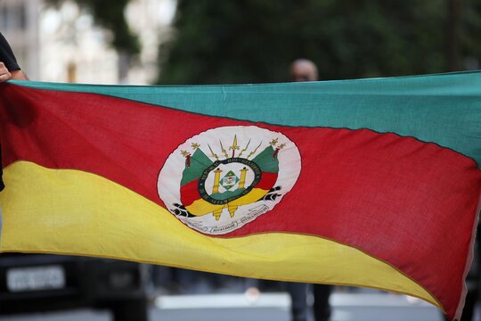 Passport book of Federative Republic of Brazil and brazilian reais money bills on brazil flag background close up
