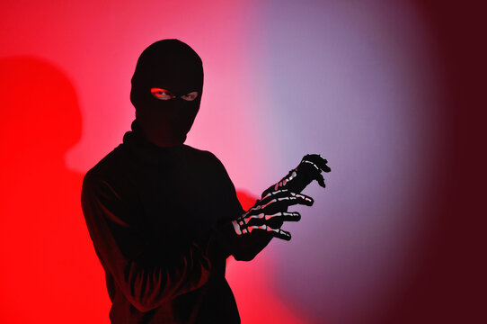 Imagem de um bandido de touca disfarçado, aplicando golpes virtuais pelo smartphone, representando a ação criminosa no mundo digital
