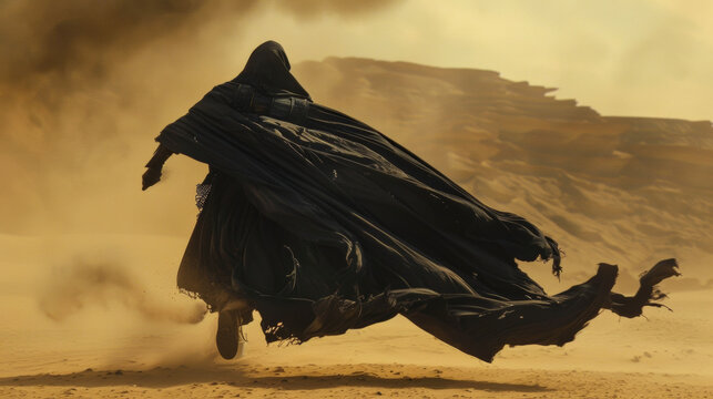 A trail of billowing black fabric follows the Barren Bandido as he races through the barren desert his cape streaming behind him like a dark banner. .