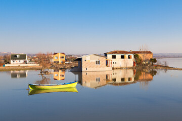 Houses and reflections in the town of Manyas, Bandirma, Turkey.