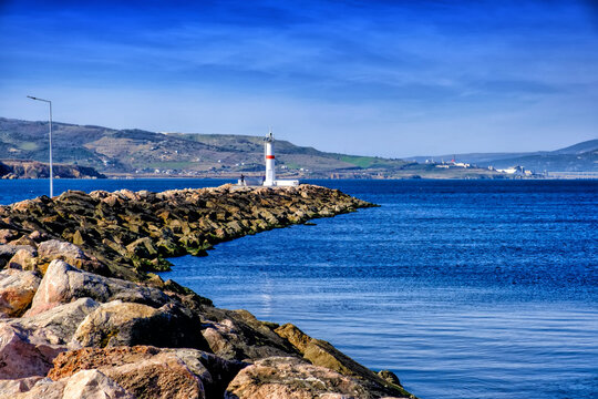 Bandirma, Turkey - February 7, 2024: Marina, embankment and lighthouse
