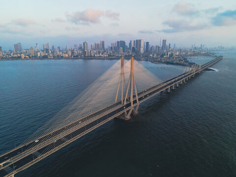 Aerial view of vehicles Passing over Bandra Worli Sea Link in Mumbai, India. Weather in Mumbai, Morning skyline Mumbai. Developing India concept. Longest Bridge in India.