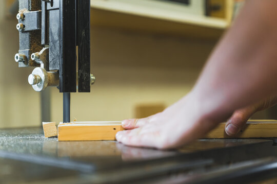 Carpenter's Hands Cutting Wood With Bandsaw