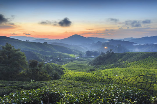 Early morning sunrise over hilly tea plantation in Cameron Highl