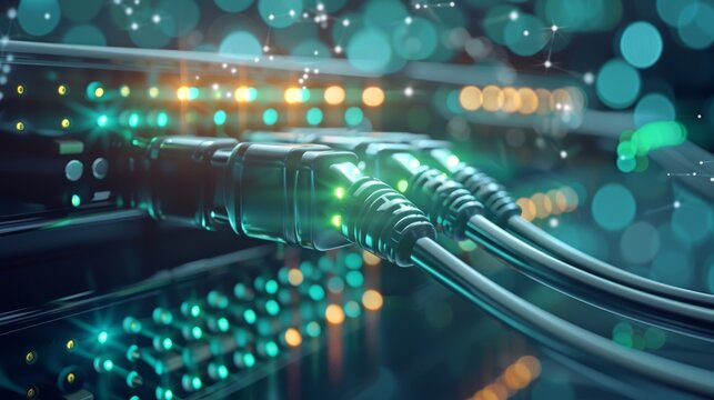 Close-up of network cables connected to server in a data center.  Green lights illuminate the cables and server.  The background is blurred with bokeh lights.