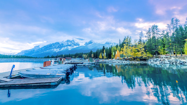 Many boats at pier in Minnewanka lake during autumn season, Banff national park