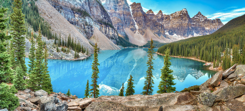 Moraine lake panorama in Banff National Park, Alberta, Canada