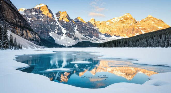 First snow Morning at Moraine Lake in Banff National Park Alberta Canada Snow-covered winter mountain lake in a winter atmosphere. Beautiful background photo