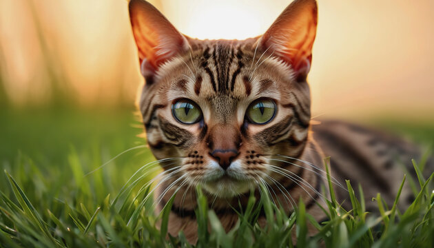 spotted bengal cat on a beige background. funny pet playing