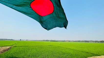Vibrant colors of the Bangladesh national flag in the wind against a backdrop of a green field