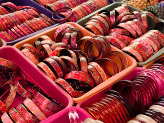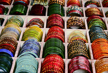 A woman’s hands carefully choose blue and gold bangles from a colorful display at a festive market, emphasizing tradition, celebration, and the allure of ethnic jewelry and accessories.