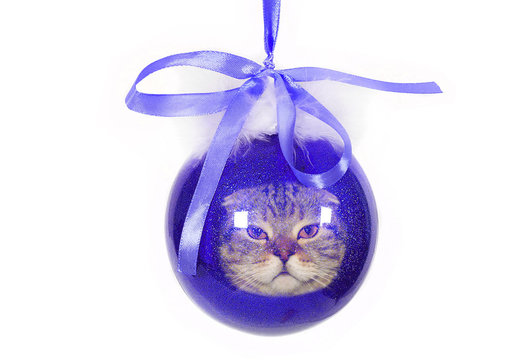 blue Christmas toy with Banik and cat face on white background